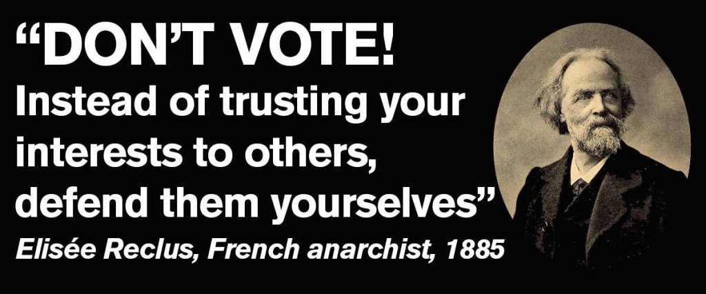 Voting also does the capitalist class a huge favour by using electoralism as a diversion away from effective politics and action. Representative ‘democracy’ has failed. We need to build autonomous alternatives from below and genuinely resist capitalism and the state with collective direct action and practice genuine solidarity with a view to creating our own decentralised structures of working class self-organisation and collective, shared power that also truly give us a voice and empower us as individuals, such as – free federations of communes – popular assemblies and worker’s councils, that are truly fair and directly democratic for ourselves and our communities. And all of that is what voting and electoralism is a deliberate diversion away from and why it is harmful to our class and to society and the political situation in general. That is why they want you to vote. All political parties and politicians should be totally rejected and that, rather than our votes, support and consent, is what they deserve.