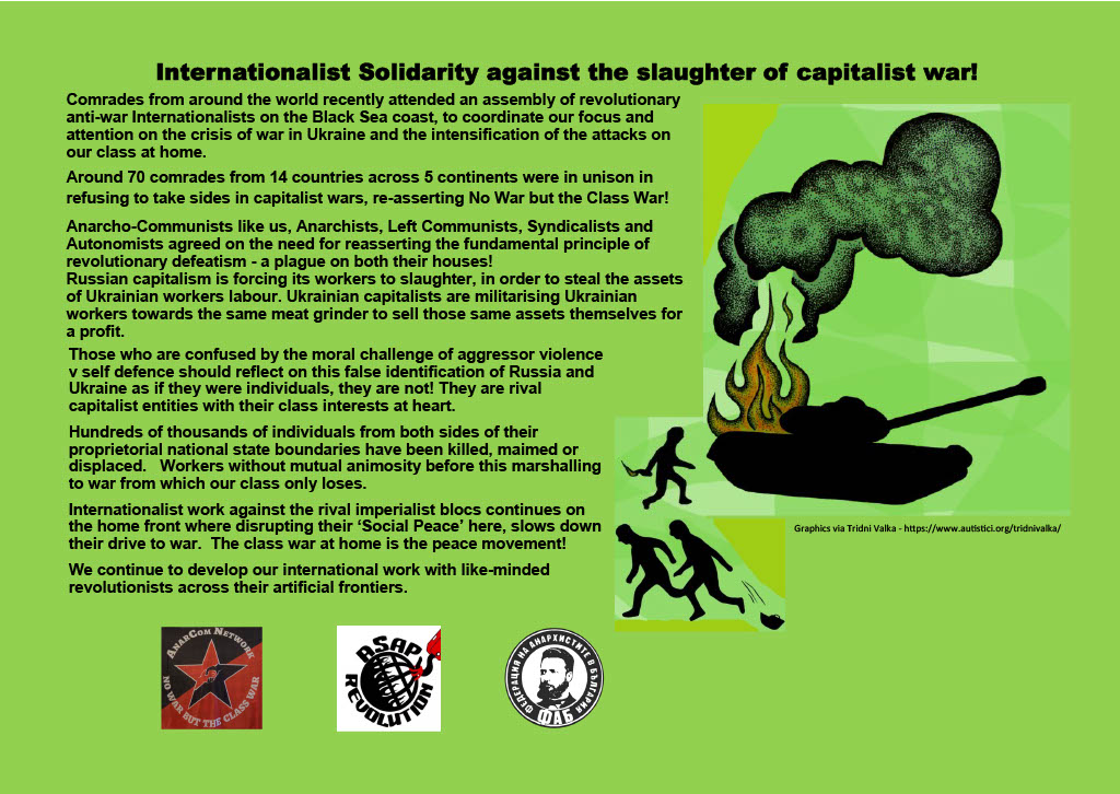 This statement was produced following the Varna International gathering of anti authoritarian groups in September. It has been co signed by our comrades in France [ASAP] and Bulgaria [FCAB] and was in response to the war in Ukraine. Its release was delayed as recent events took precedence, but is relevant to any war, conflict or state violence.