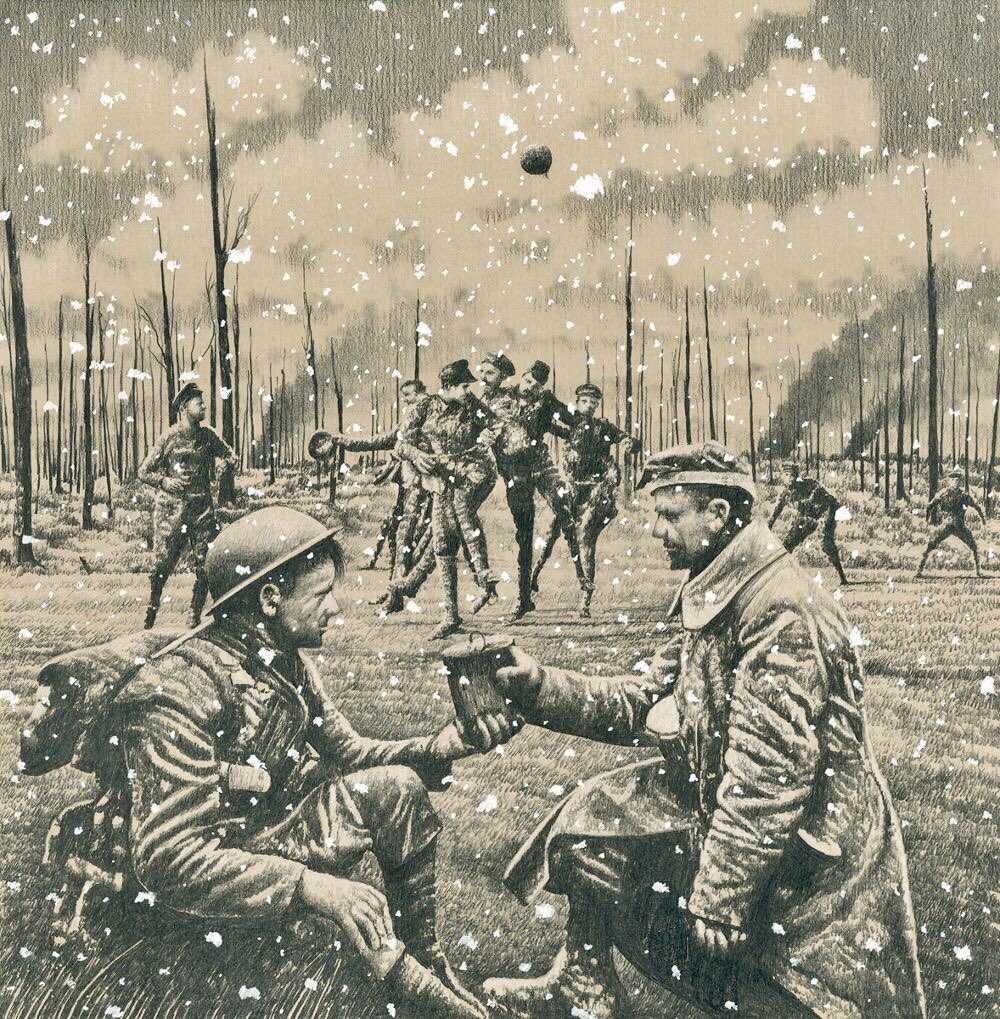 And along that line we were suddenly able to see Germans doing exactly the same thing all out in the open. And we just looked at each other for some time and then one or two soldiers went towards them. They met, they shook hands, they swapped cigarettes. They got talking. The war, for that moment, came to a standstill.” Rifleman Graham Williams, 5th London Rifle Brigade